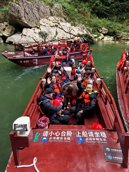 次日清晨,车友们乘船探秘蒲花暗河,在“三天两夜”的时空穿梭中感受大自然的鬼斧神工。随后前往神龟峡,领略“船在江上行,人在画中游”的诗意画卷。